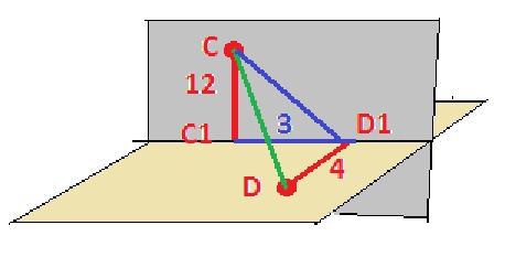 Через точки С і Д, які лежать в двох паралельних площинах, проведені перпендикуляри СС1 і ДД1 на пряму перетину площин. Знайти довжину відрізка СД, якщо СС1=12см, ДД1=4,С1Д1=3