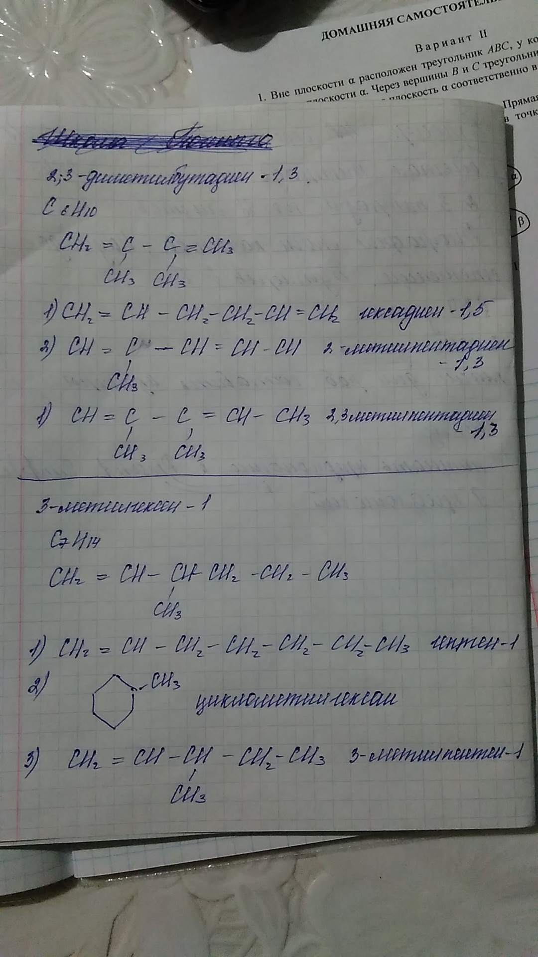 Помогите !!! Составьте структурную формулу 2,3-диметилбутадиен-1,3,3-метилгексен-1.Напишите молекулярную формулу.Составьте формулы двух изомеров и одного гомолога,дайте им название.