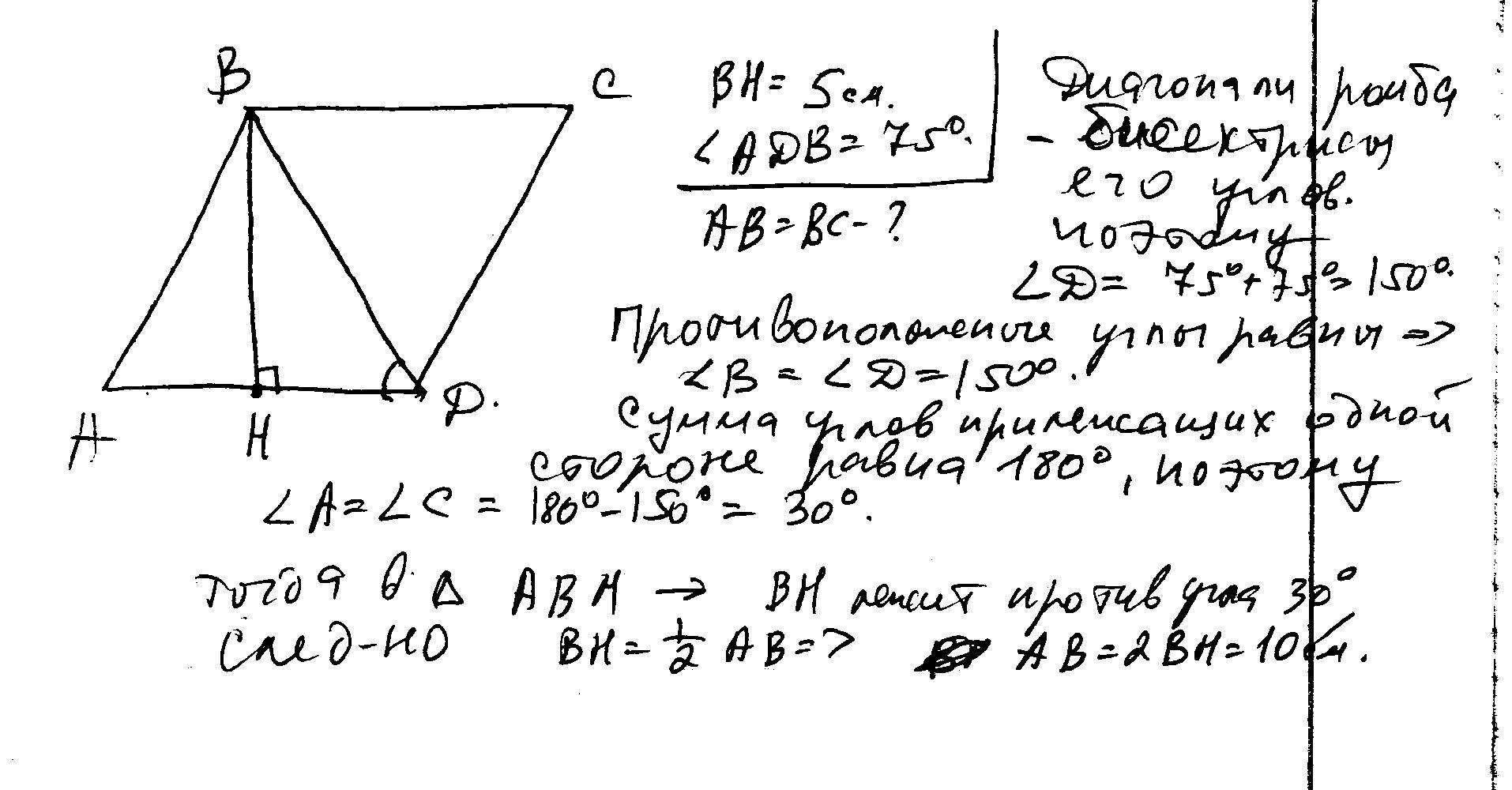 Высота ромба равна 5 см.Найдите его сторону если угол между стороной ромба и одной из его диагоналей равен 75 градусов