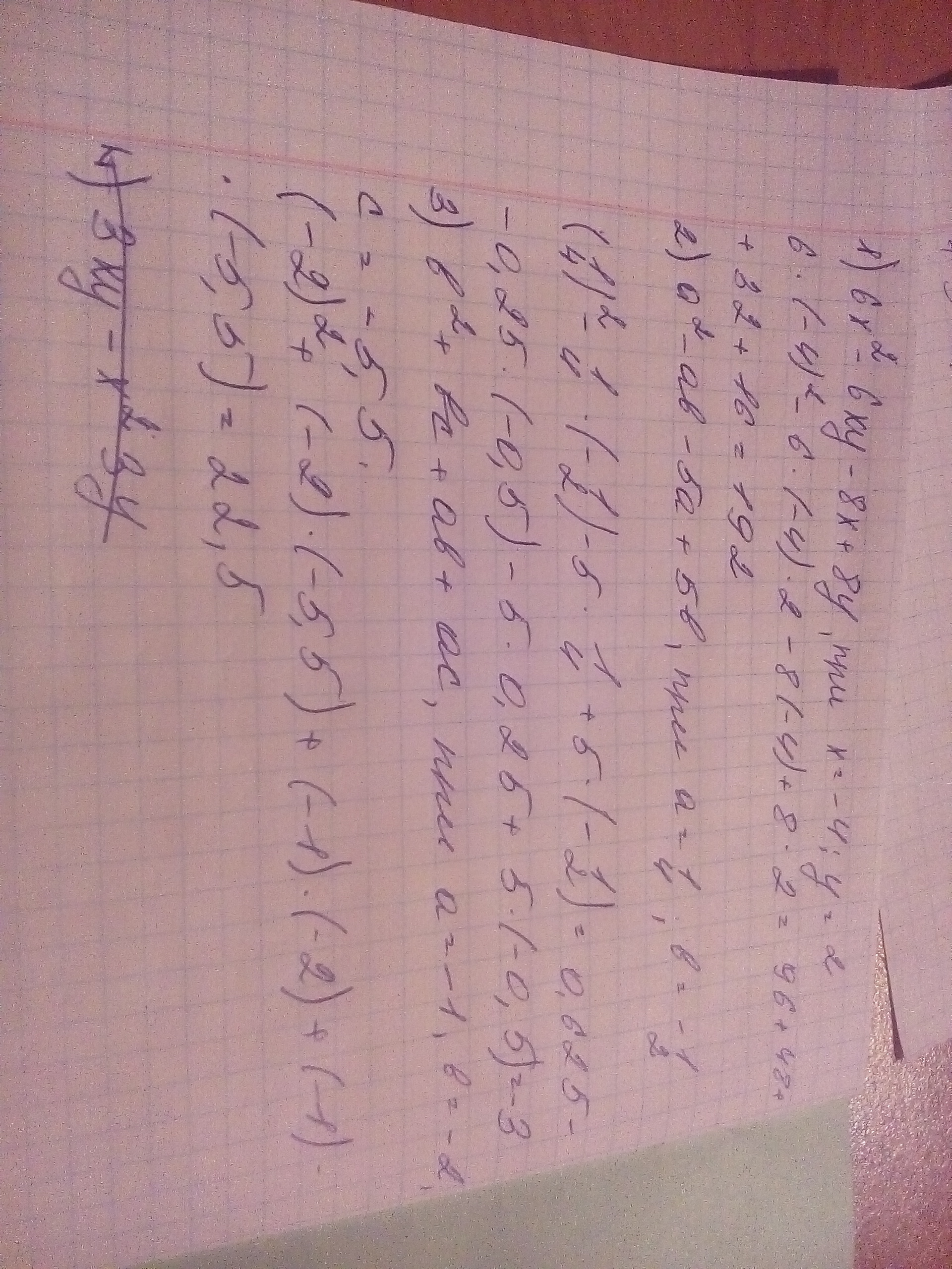 Найдите значение выражения:1)6х^2-6xy-8x+8y при х=-4,у=2;2)а^2-ab-5a+5b при а=1/4,b=-1/2;3)b^2+bc+ab+ac при а=-1,b=-2,с-5,5;4)3ху-х^3y^3-6+2x^2y^2 при х=2/3,у=-3/4.