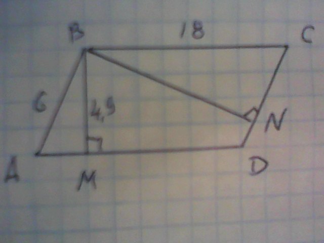 3)Вычислим площадь параллелограмма S=АD·ВМ=18·4,9=88,2 см²