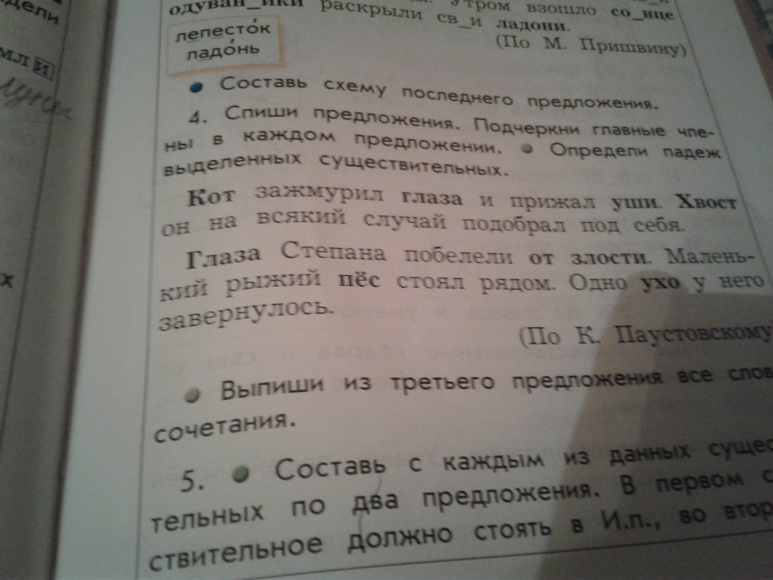 Кот (и. п) зажмурил глаза (в. п) и прижал уши (в. п) . Хвост (и. п) он на всякий подобрал под себя. (Кот подлежащее,зажмурил сказуемое,уши подлежащее,прижал сказуемое)