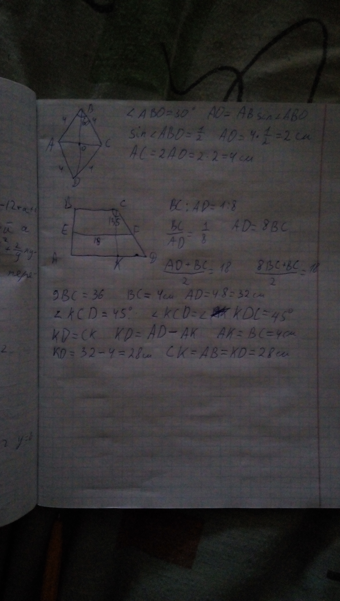 В прямоугольной трапеции один из углов равен 135 градусов средняя линия 18см, а основание относится как 1:8. Найдите меньшую боковую сторону
