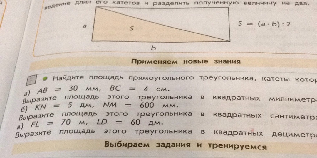 ‹ едите длин его катетов и разделить полученную величину на два ‚ км К . а 5 = Ь Применяем знания Ш . Найдите площадь прямоугольного треугольника катеты котом Ад = 30 мм ВСЯ = 4 см площадь ЭТОГО треугольника В миллиметр 6) км = 5 дм ММ = 600 мм ‘ Выразив этого треугольника в квадратных сантиметр Выразив площадь этого треугольника в квадратных дециметр Выбираем задания и тренируемся