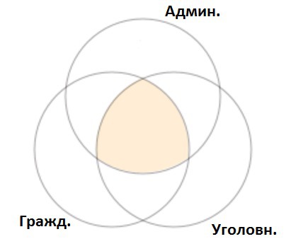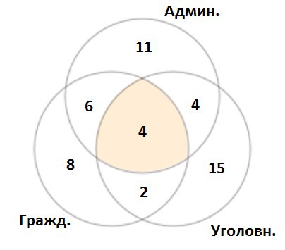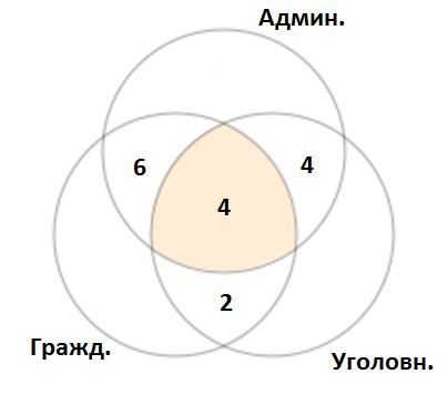 Выразим условие задачи графически. Обозначим кругом тех кто специалист по гражданскому праву, другим - тех кто специалист по уголовному праву, третьим - тех кто специалист по административному праву. Специалистов во всех трёх правах - 4, значит в общей части вписываем число 4.