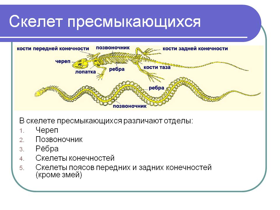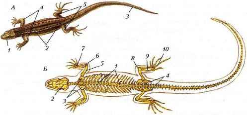 Строение тела ящерицы: А — внешнее строение: 1 — голова; 2 — туловище; 3 — хвост; 4 — передние конечности; 5 — задние конечности; Б — скелет: 1 — позвоночник; 2 — череп; 3 — пояс передних конечностей; 4 — пояс задних конечностей; 5 — плечо; 6 - предплечье; 7 — кисть; 8 - бедро; 9 — голень; 10 — стопа