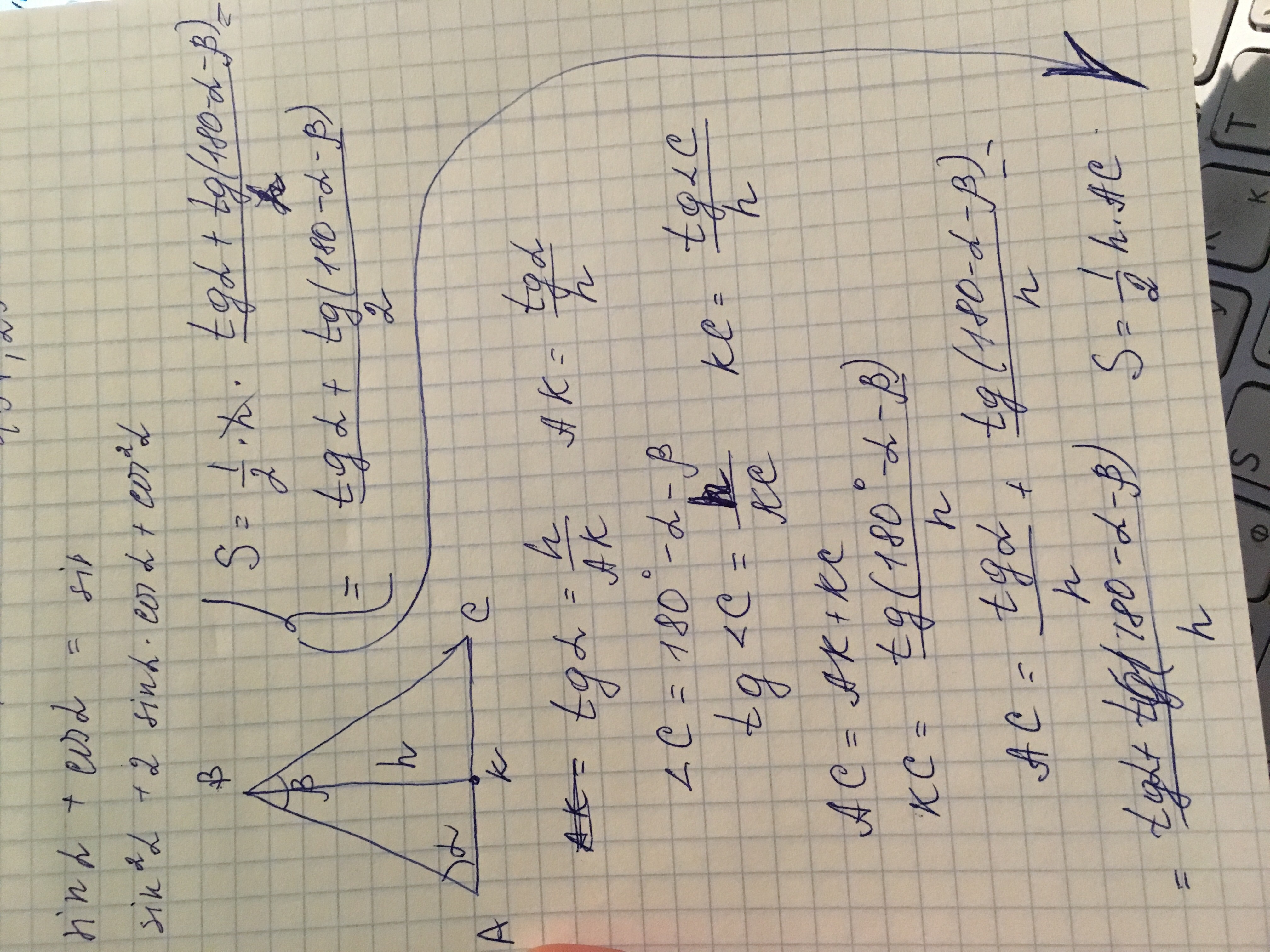 Отсюда S = (1/2)AB*BC*sin β = (h²sin β) / (2sin α*sin(α+β)).