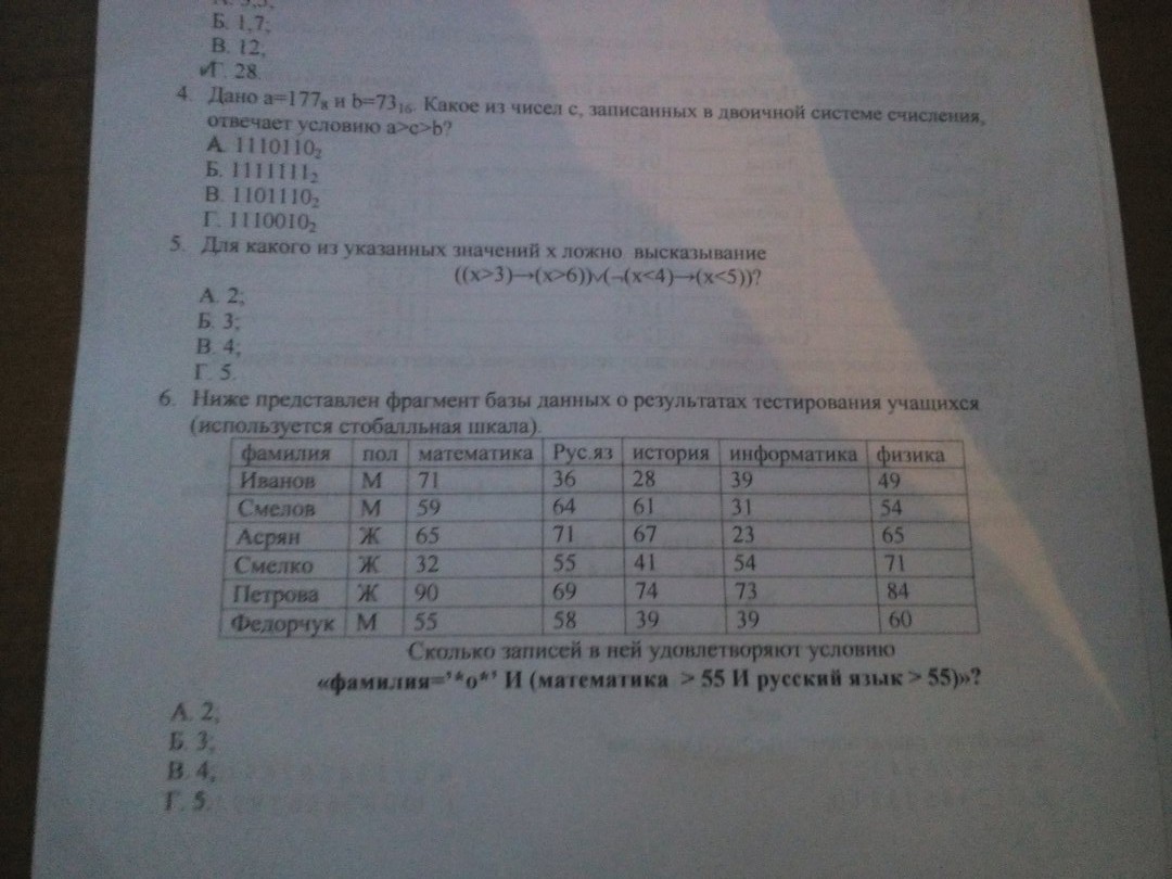 3) Дано а= 177 в восьмеричной системе и b=73 в шестнадцатеричной. Какое из чисел c, записанных в двоичной системе счисления, отвечают условию a>b>c?