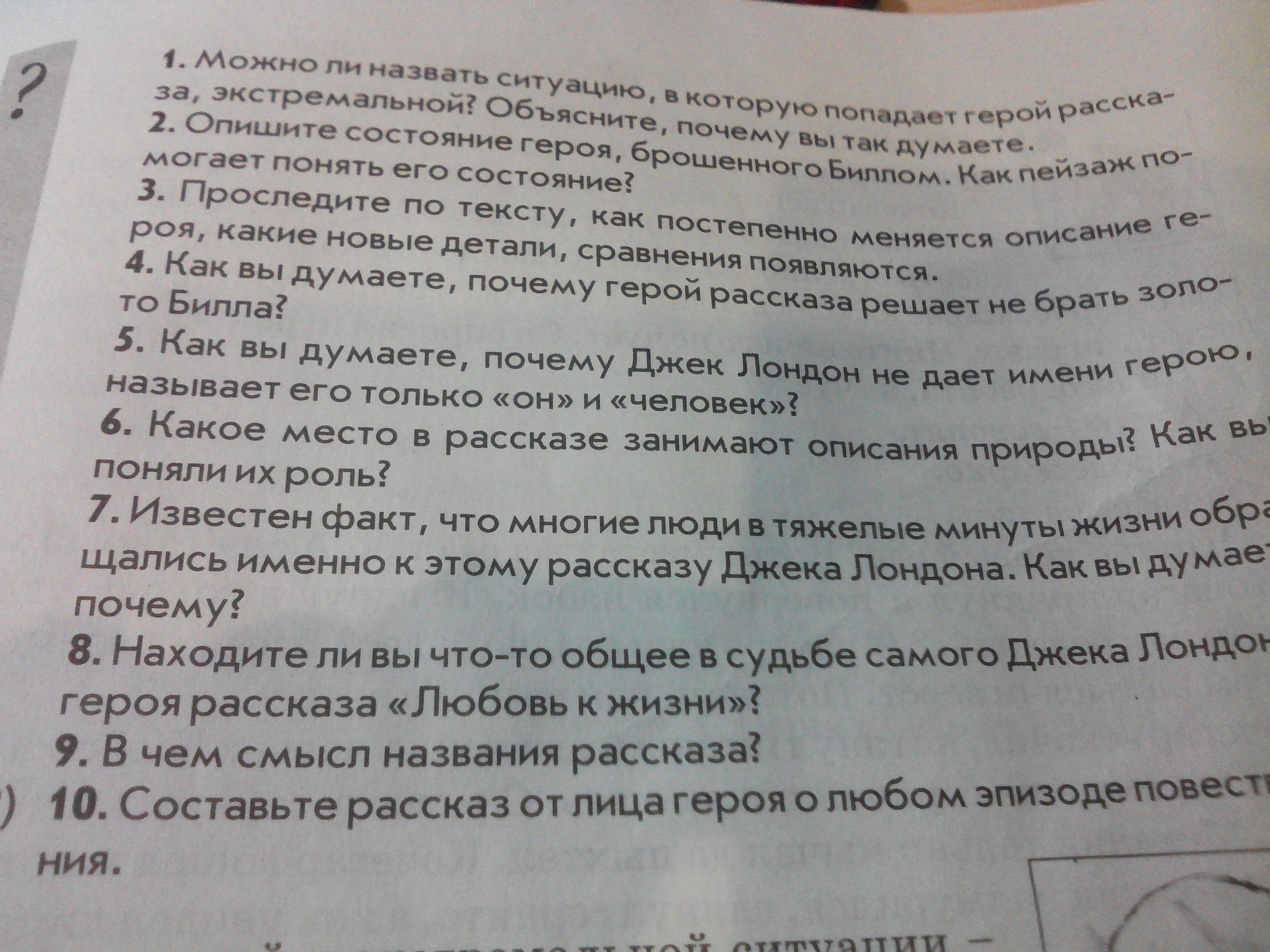3)В действиях и поведении героев рассказа «Любовь к жизни» (1906) мы видим неспособность что-то понять, уступить, помочь друг другу. Два старателя после удачных поисков возвращаются домой. Один из них вывихнул ногу и попросил другого помочь, но тот предпочел двигаться дальше, он не остановился и не помог. И как ни кричал товарищ вслед уходящему, тот не обратил на его мольбы о помощи никакого внимания. Он уносил свою долю совместно добытого золота, разделив даже спички. Голод мучил путника.. . Он заблудился, пытался поймать куропатку, но тщетно. Глядя, как улетает куропатка, человек чувствовал к ней такую ненависть, будто она причинила ему страшное зло. Потух костер, повалил снег. Отчаяние было так велико, что человек даже разделил свое золото пополам и выбросил половину, а позже — и вторую: не было сил нести лишний груз. К вечеру он пришел к месту, где волки задрали олененка, и стал грызть оставшиеся кости, высасывать мозг. Ему стало казаться, что умереть не так страшно, больнее — жить. Однако жажда жизни влекла его в путь.
