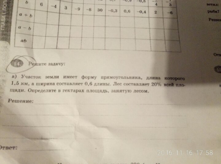 1. 1.5 х 0.6 = 0.9 - ширина участка 2. 1.5 х 0.9 = 1.35 кв.км ( 13.5 га) 3. 13.5 - 100% х - 20 % х = 13.5 * 20 : 100 = 2.7 га - занято лесом