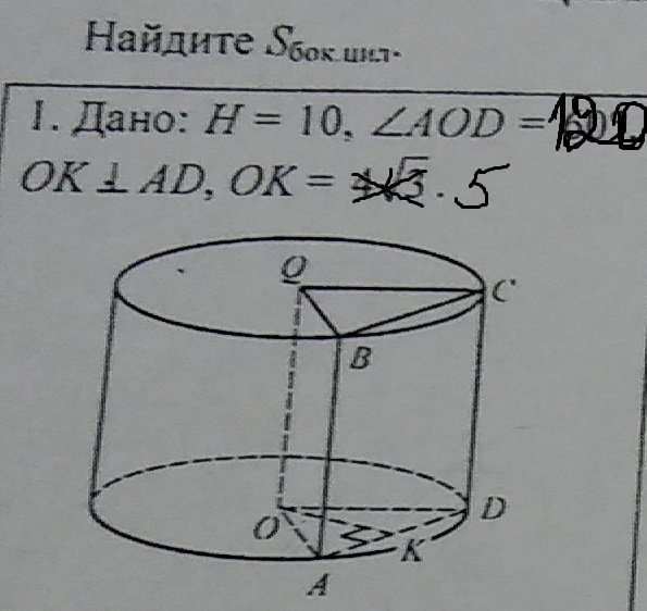 Дано:цилиндр, H=10, угол AOD = 120, OK перпендикулярно AD, OK= 5.