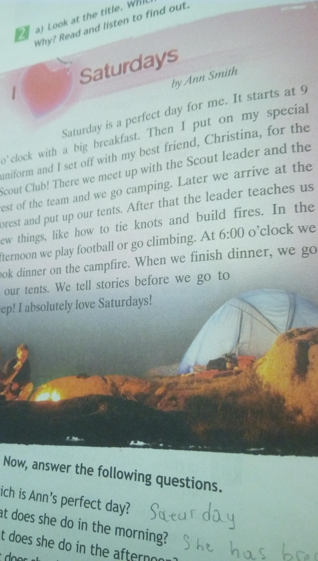 Суббота - идеальный день для меня. Он начинается в 9 утра с большого завтрака. Потом я одеваю свою форму и отправляюсь со своей лучшей подругой Кристиной в Клуб Скаутов. Там мы встречаем главу Клуба и остальную команду и идем в поход. Потом мы приходим в лес и разбиваем палатки. Потом старшие учат нас новым вещам, например как завязывать узлы и разжигать костер. В полдень мы играем в футбол или занимаемся восхождением на гору. В 6 вечера мы готовим обед на костре. После обеда мы возвращаемся в палатки. Мы рассказываем истории перед тем как пойти спать! Я очень люблю субботы!