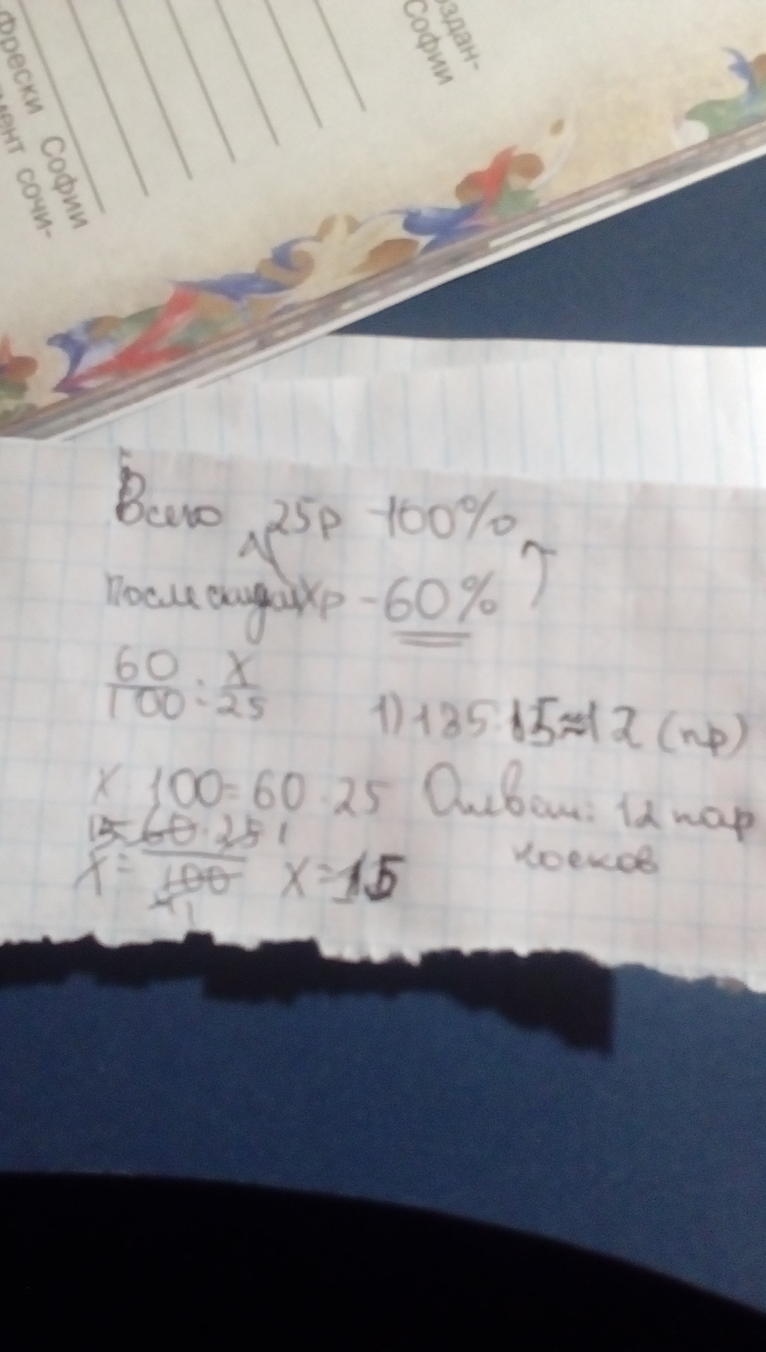 пара носков стоит 25 рублей.какое наибольшее число парк носков ожно купить на 185 рублей во время распродажи,когда скидка составляет 40℅