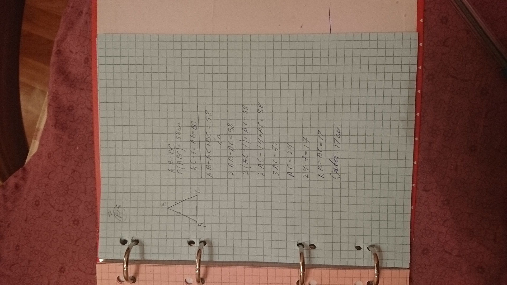 Периметр равнобренного треугольника равен 58см.Основание больше боковой стороны на 7см.Найдите боковую сторону