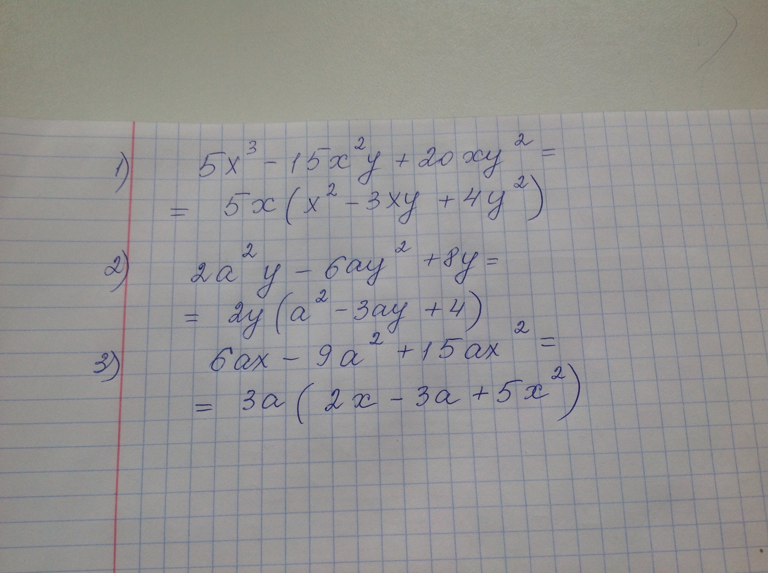 Прошу помогите очень срочно!!!Представьте в виде произведения :1) 5x^3-15x^2y+20xy^2. 2)2a^2 y-6ay^2+8y 3)6ax -9a^2 + 15 ax^2 (^обозначает степень)