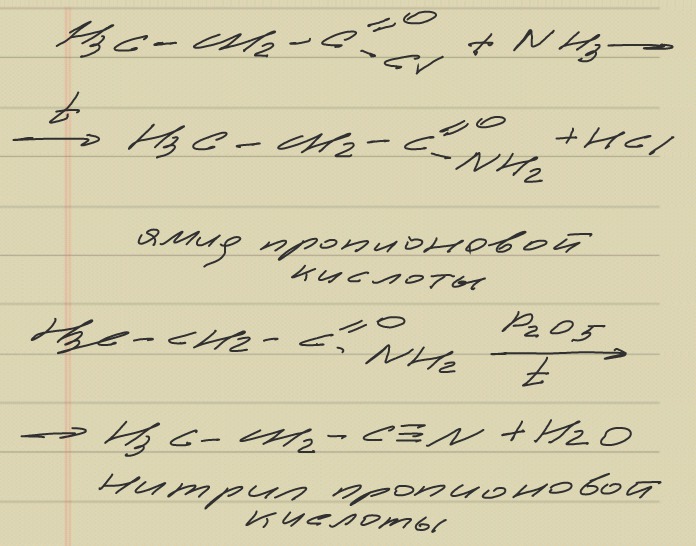 4. Какое соединение образуется , если хлорангидрид пропионовой кислоты обработать аммиаком и полученный продукт нагреть с P2O5?