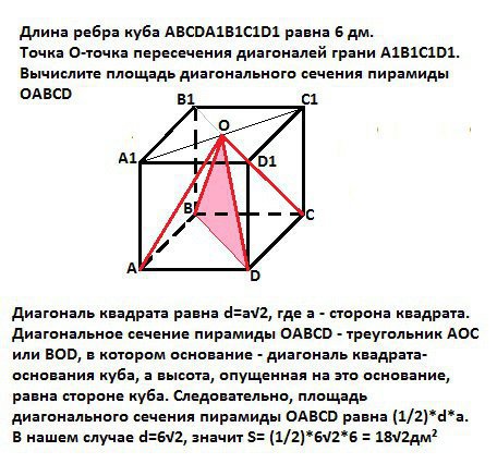 длина ребра куба ABCDA1B1C1D1 равна 6 дм. точка О- точка пересечения диагоналей грани A1B1C1D1. вычислите площадь диагонального сечения пирамиды ОАВСD
