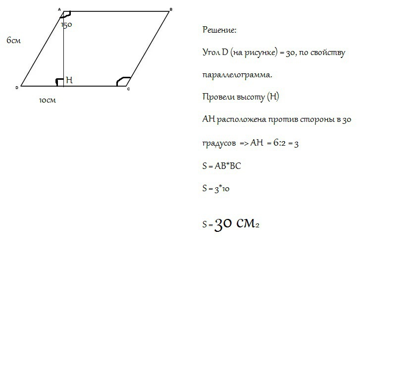 Стороны параллеограма 10см и 6см,а угол между ними 150 градусов.Найдите площадь,это геометрия,ошибся