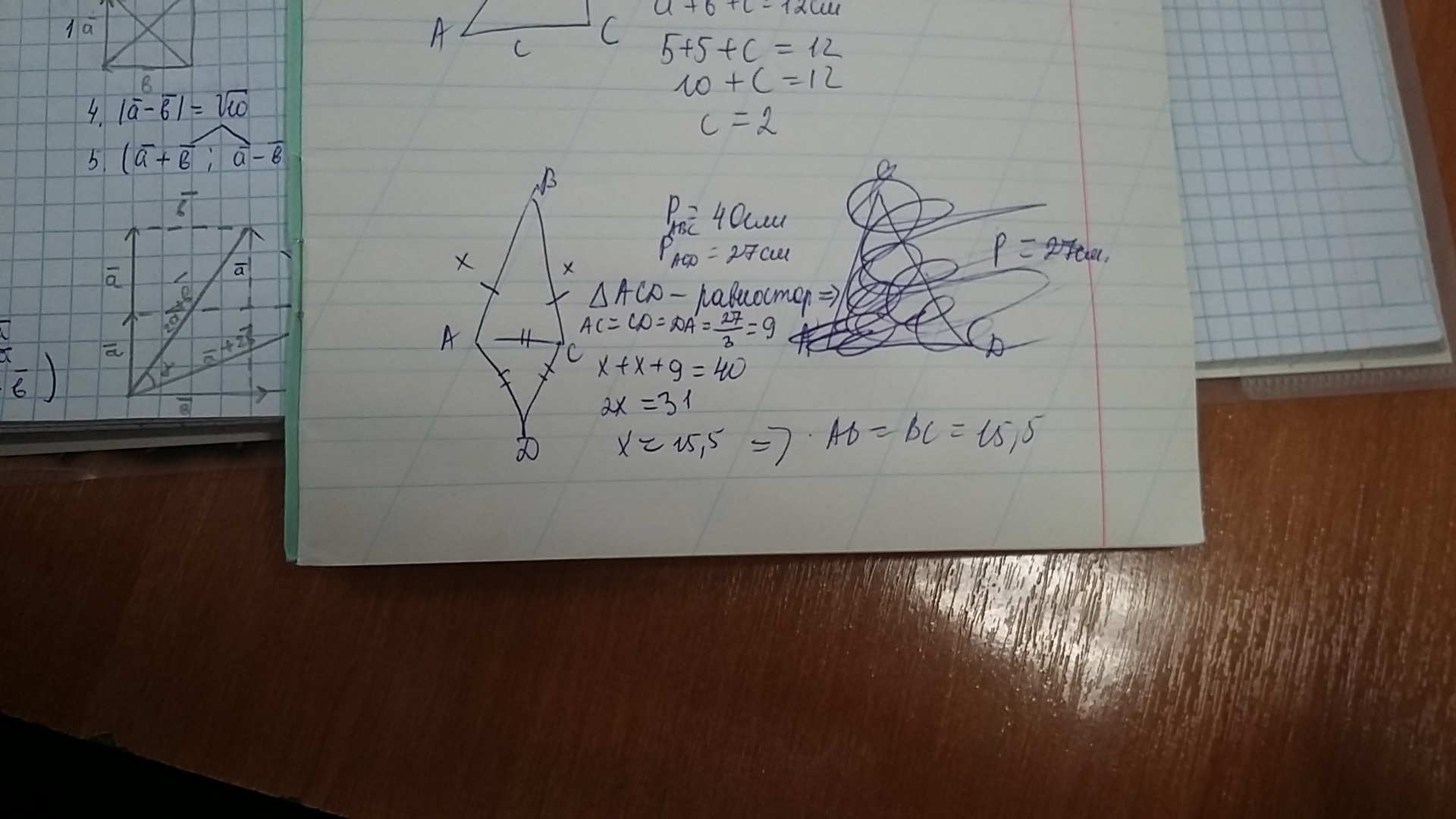 Периметр равнобедренного треугольника ACB с основанием AC равен 40 см, а периметр равностороннего треугольника ACD равен 27 см. Найди длину боковой стороны равнобедренного треугольника.