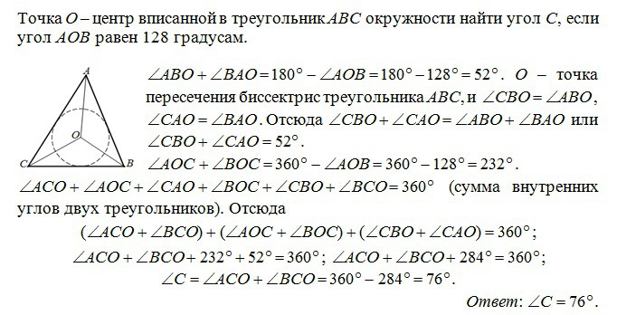 точка o центр вписанной в треугольник ABC окружност. найдите угол C треугольника, если угол AOB равен 128 градусов