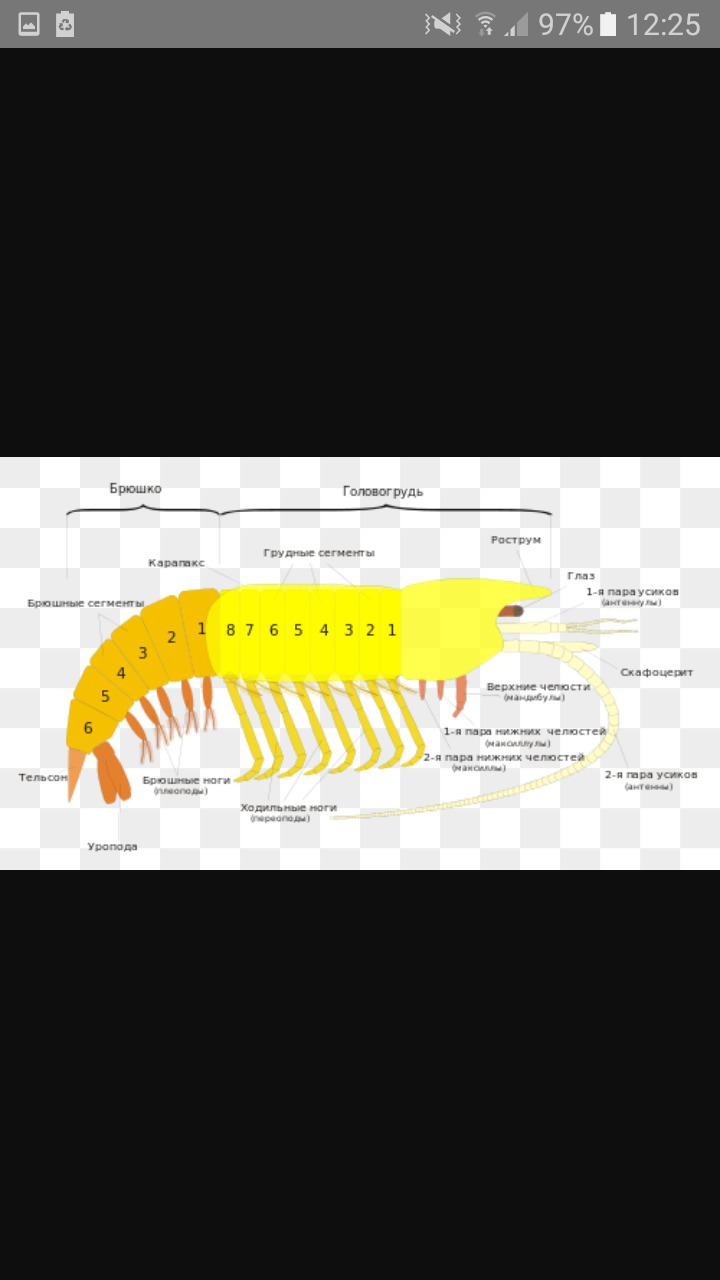 - Ракообразные: Тело ракообразных составляет в длину от 0,5 мм до 80 см. Оно покрыто хитиновым панцирем и состоит из головы, груди и брюшка. На голове имеются две пары осязательных придатков (антенн и антеннул) и три пары челюстей. Грудь и брюшко сегментированы. Количество ног у разных групп ракообразных может варьировать.
