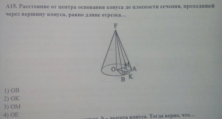 Расстояние от центра основания конуса до плоскости сечения, проходящей через вершину конуса, равно длине отрезка...