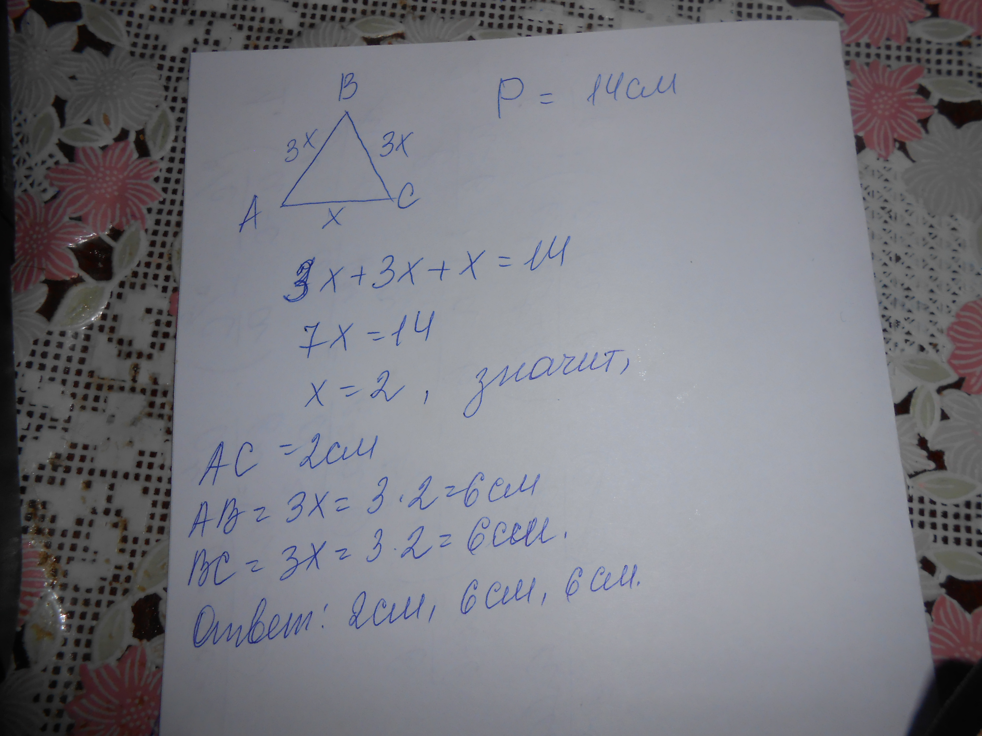 периметр треугольника 14 см а боковая сторона в 3 раза больше основания найти все стороны треугольника