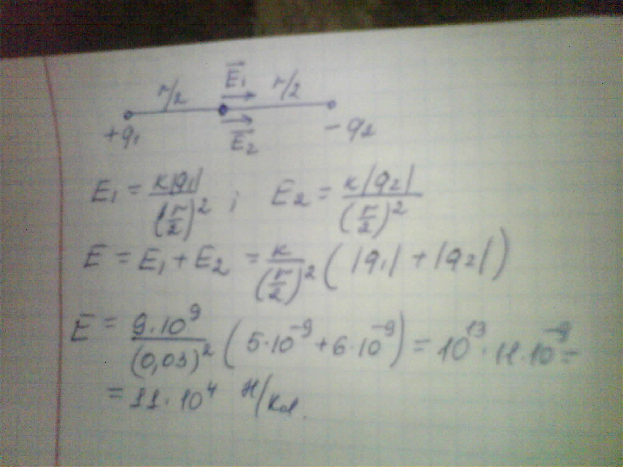 Расстояние между двумя точечными зарядами q1 = 5 * 10 в -9 и q2= -6*10 в -9 Кл равно 6 см. Напряженность поля в вакууме в точке, лежащей посередине между зарядами, равна ?