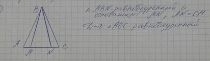 Треугольник BCN. Угол BNC=180-уг BNM. Так как угол BMN=BNM (по условию). Тогда треугольники BNC=BMA и AB=BC. Следовательно ABC - равнобедренный.