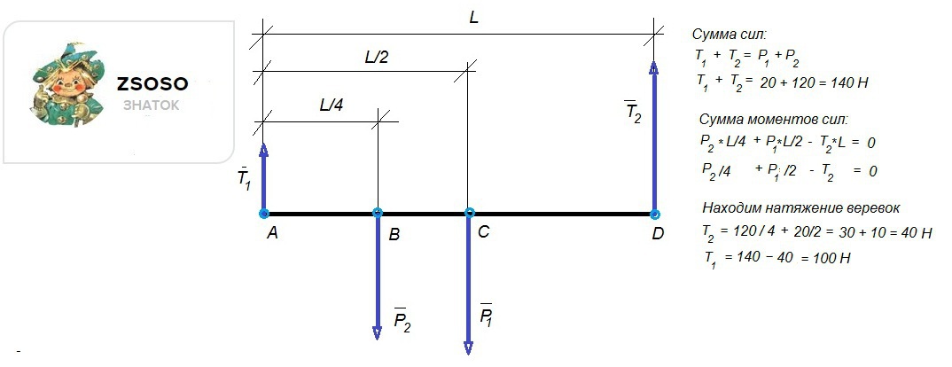 Стержень длиной 1 м и массой 2 кг подвешен за концы горизонтально на двух веревках. На расстоянии 0,25 м от левой веревки к стержню подвешен груз массой 12 кг. Определить силы натяжения веревок.
