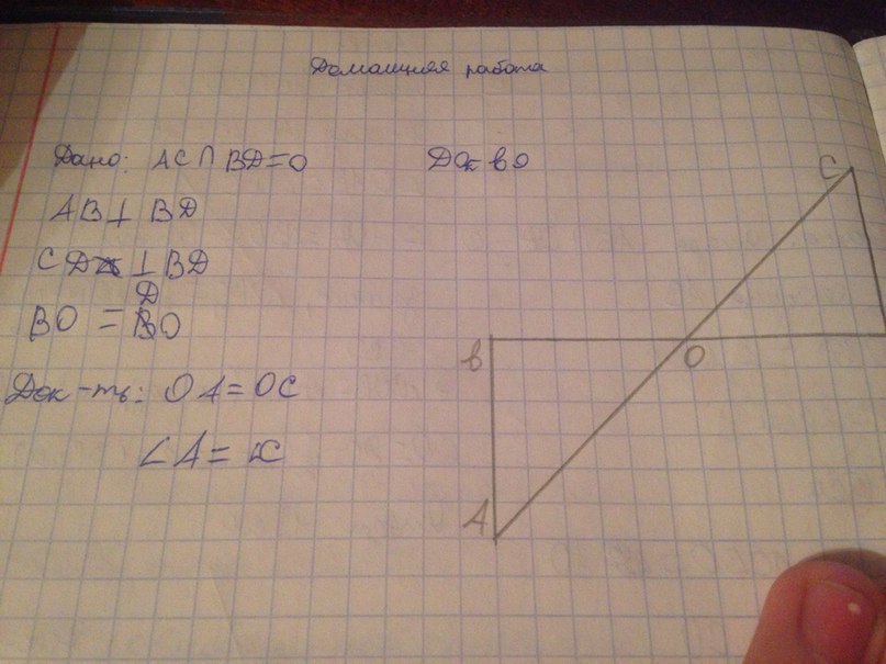 рассмотрим треугольники аов и осд. ов =од и вд перпендикуляр ав и угол в=90. аналогично угол д= 90. получается треугольники равные АОВ = ОСД. значит угол А = углу С. также АО =ОС.