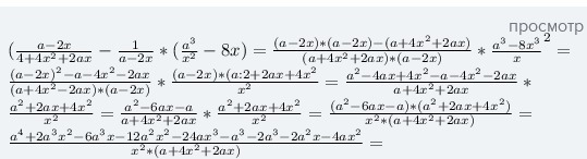 1)=((a-2x)/(a+4x^2+2ax) -1/(a-2x) ) *((a^3-8x^3)/x2)=((a-2x)(a-2x)(a^2+2ax+4x^2)) /((a+4x^2+2ax)x^2) -(a-2x)(a^2+2ax+4x^2)/((a-2x)x^2)=