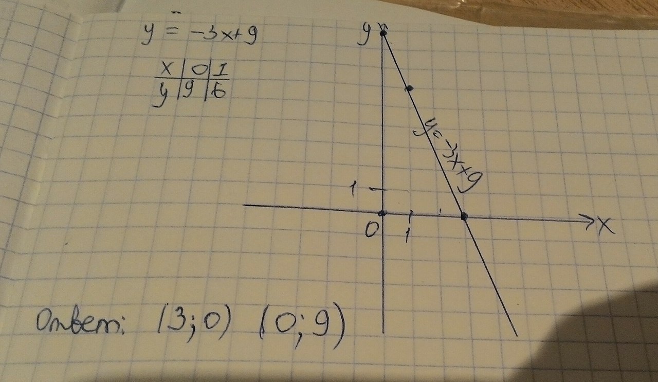 Вычислите координаты точек в которых прямая y=-3x+9 пересекает ось x, ось y. Постройте эту прямую.