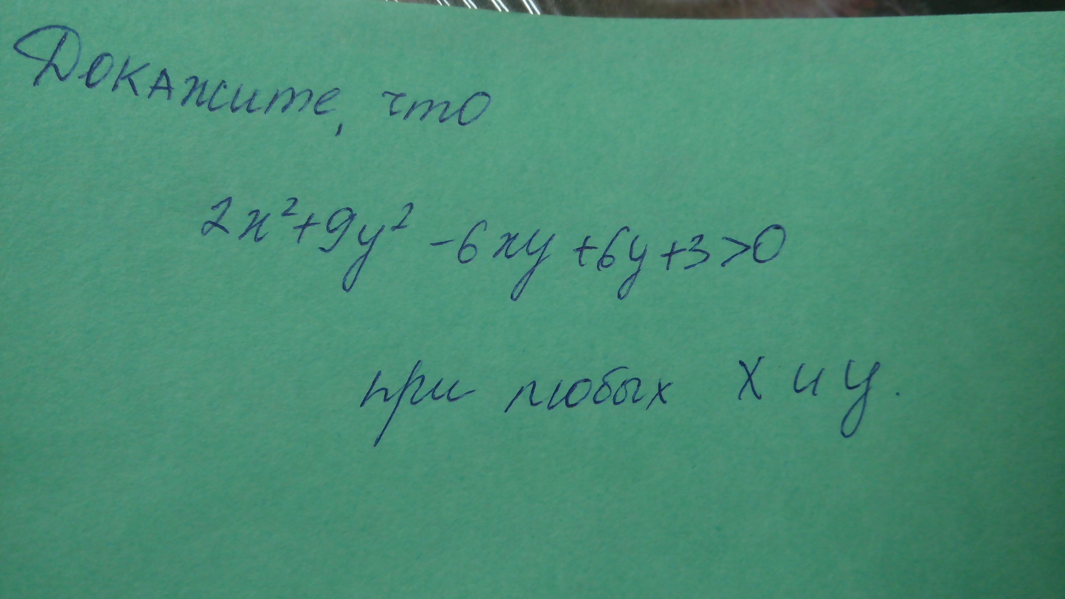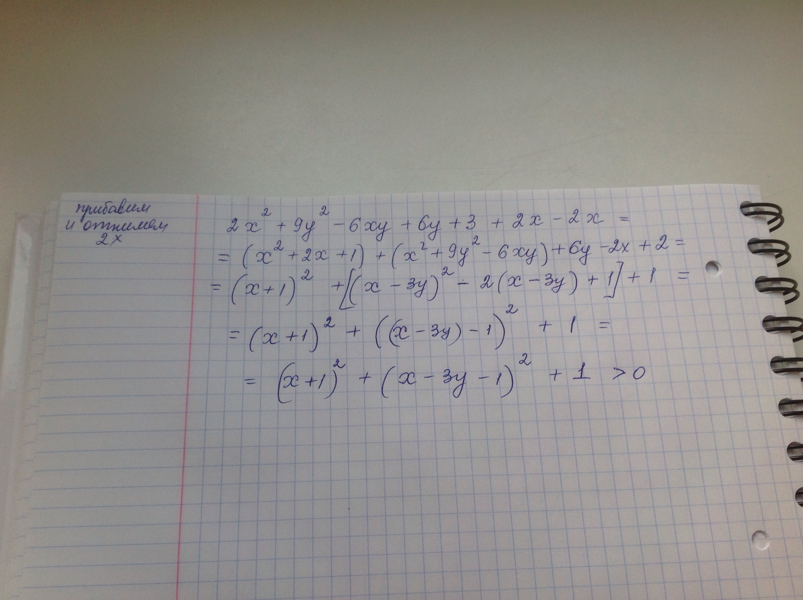 Докажите, что 2x^2+9y^2-6xy+6y+3>0 , при любом X и y