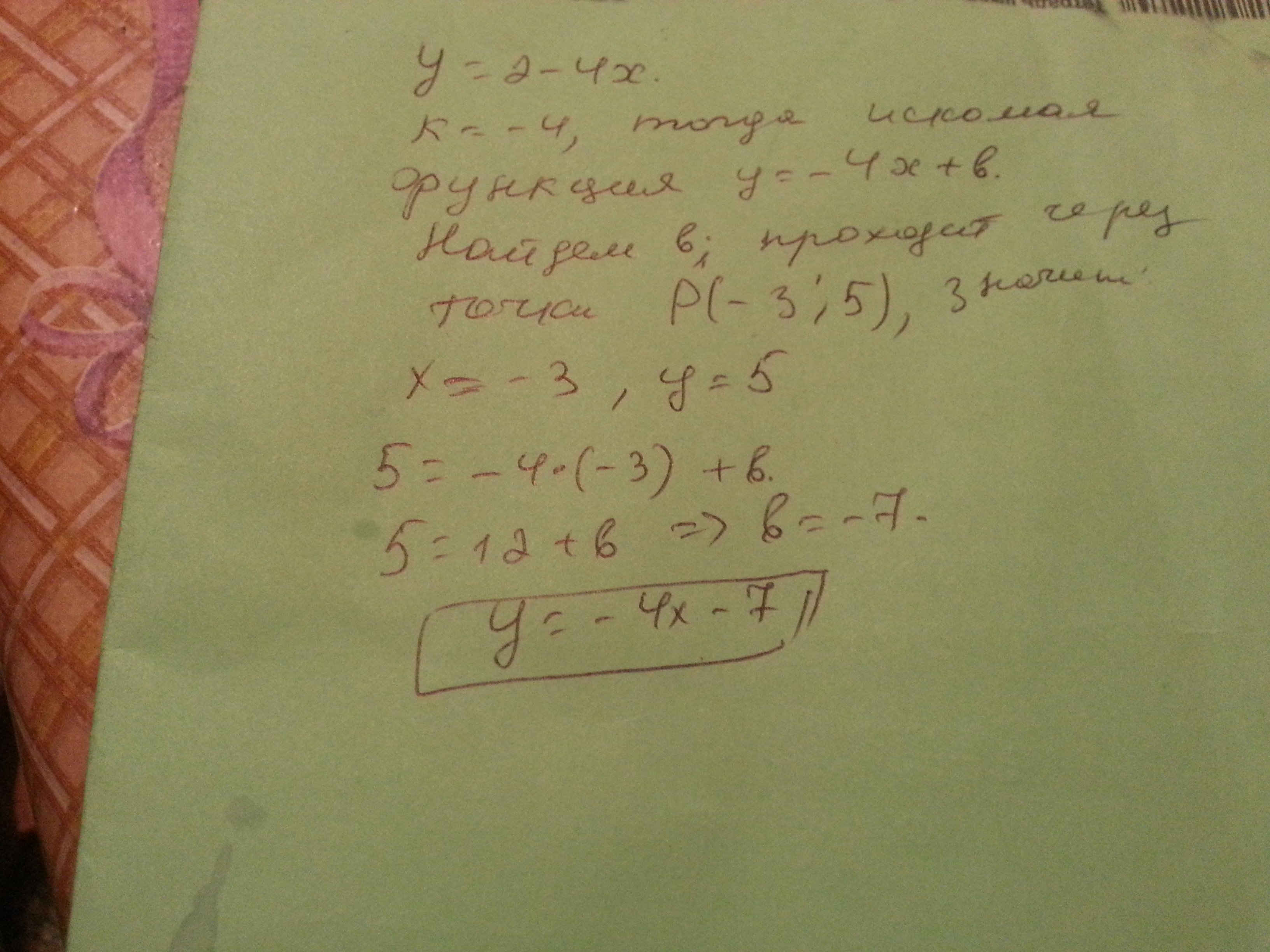 задайте формулой линейную функцию,граффик которой параллелен прямой y=2-4x и проодит через P(-3;5)