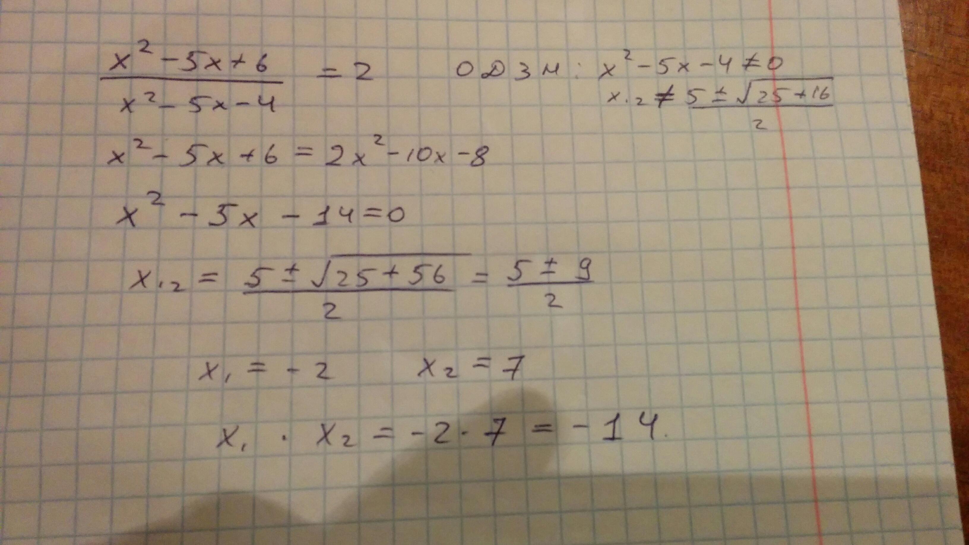 Найдите произведение всех значений х. при которых значение дроби х²-5х+6 деленое на х²-5х-4 равно 2.