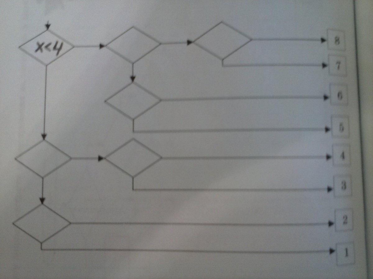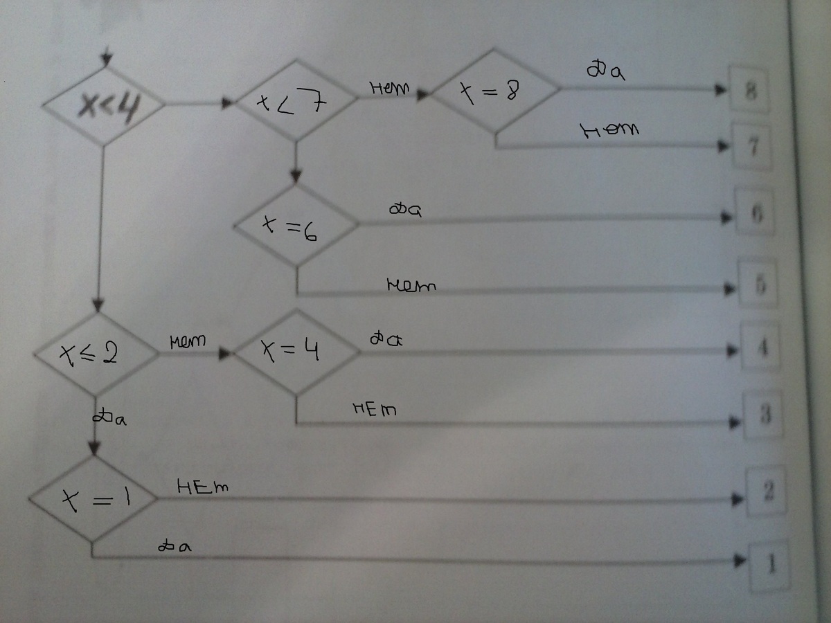Петя и Коля играют в следующую игру. Петя задумывает натуральное число, не превосходящее 8. Коля должен это число отгадать. Он может задавать Пете вопросы, допускающие только ответы "да" и "нет". Коля старается за наименьшее число вопросов отгадать число, задуманное Петей. Его стратегия основана на делении числового интервала пополам и выяснении, в какой из половин находится задуманное число. Пользуясь этой стратегией, внесите недостающие записи в схему.
