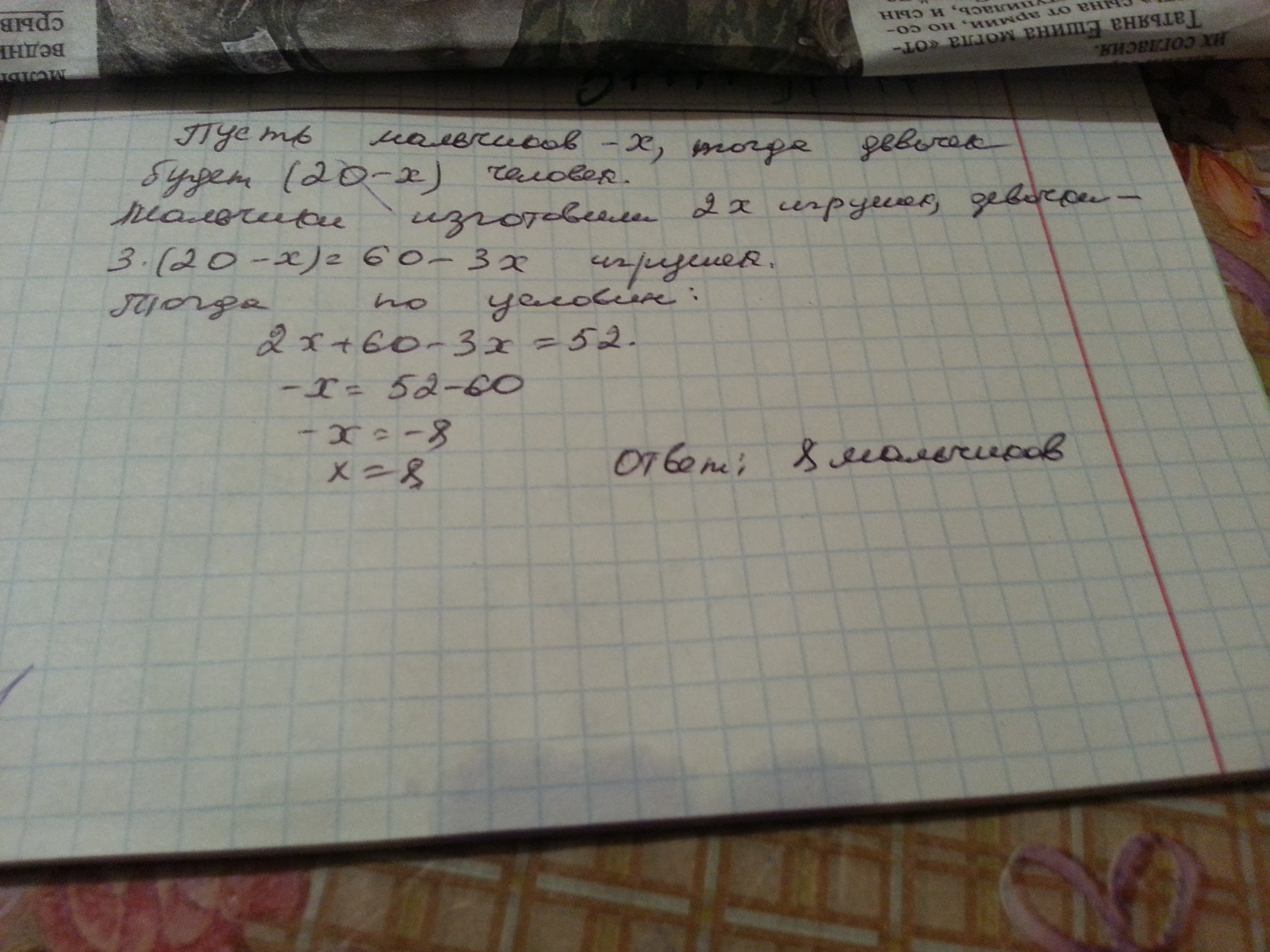 20-х-число девочек,изготовили 3(20-х)=60-3х игрушек