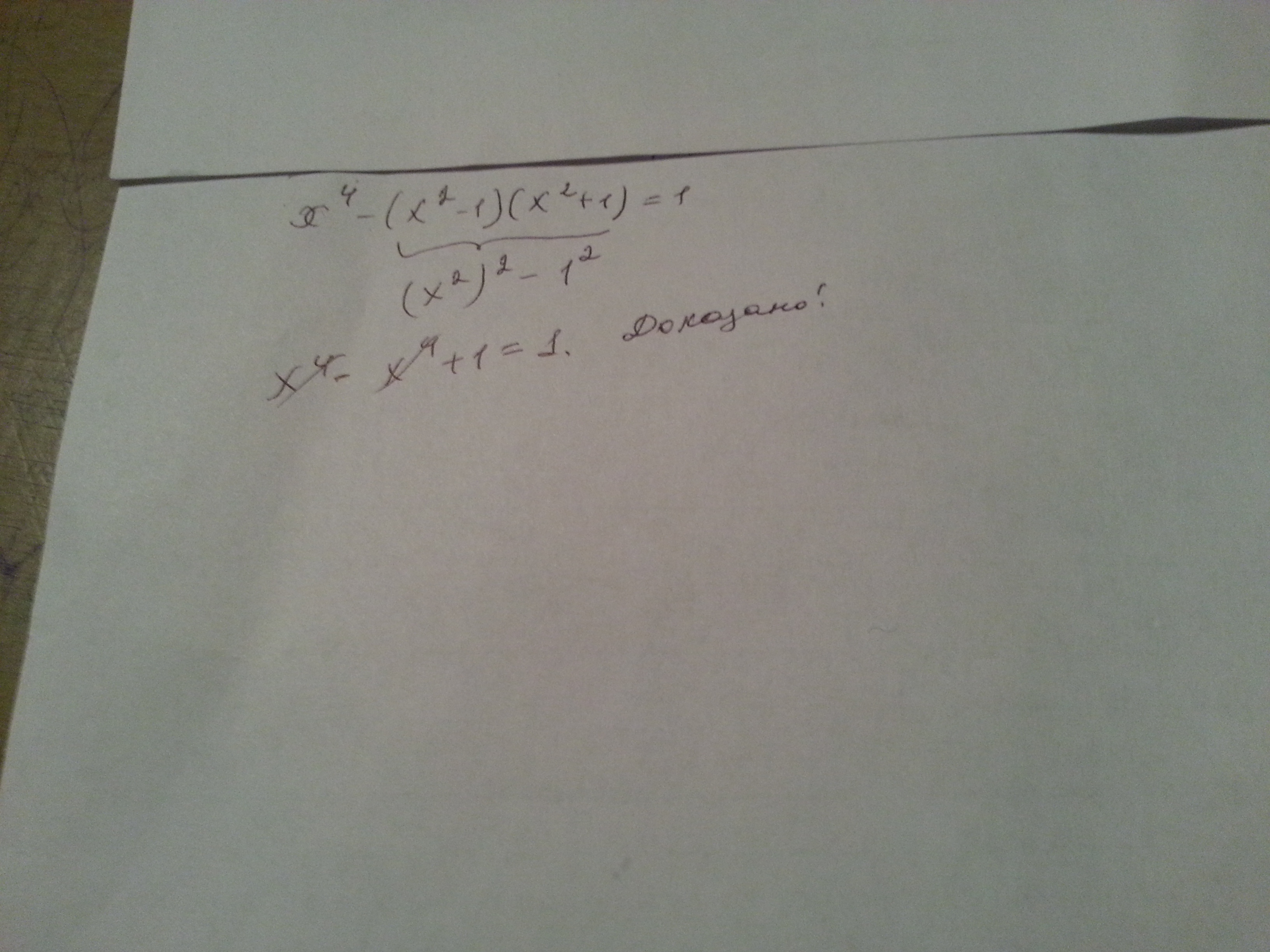 это формула разность квадратов; сворачиваем: (x^2-1)(x^2+1)=x^4-1; получаем: x^4-x^4+1=1; 0=1-1; 0=0; Доказано