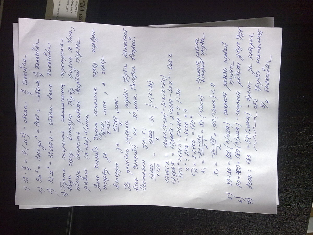 Бассейн объемом 12 м3 можно наполнить с помощью двух труб, открывая либо одну из них, либо сразу обе. Известно, что первая труба пропускает на 20л воды в минуту больше, чем вторая. Сколько минут потребуется для наполнения бассейна на три четверти при открывании сразу двух труб, если первая в одиночку заполняет весь бассейн на 30 минут быстрее, чем вторая?