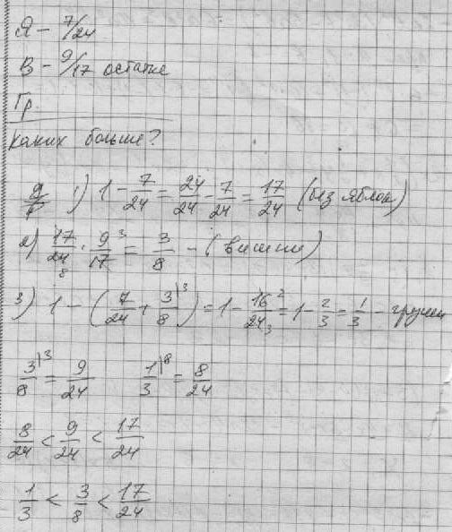 Яблони составляют 7/24 деревьев, растущих в саду, вишни-9/17 оставшихся деревьев, а остальные деревья-груши. Каких деревьев в саду растёт больше всего?