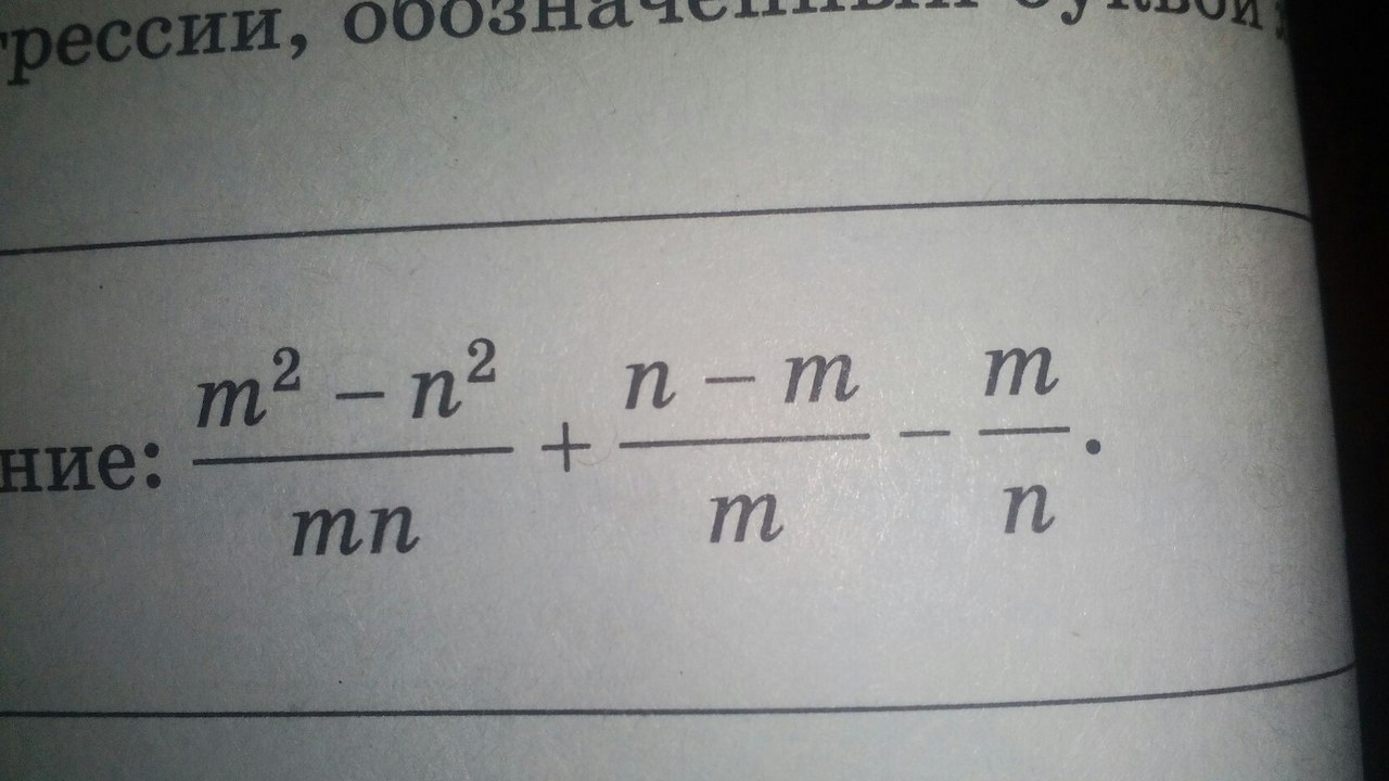 frac{m ^{2} -n ^{2} }{mn} + frac{n-m}{m} - frac{m}{n} =  frac{m^{2}-n^{2}+n(n-m)-m ^{2}   }{mn} =  frac{-n ^{2}+n ^{2}  -mn}{mn} =  frac{-mn}{mn} =
