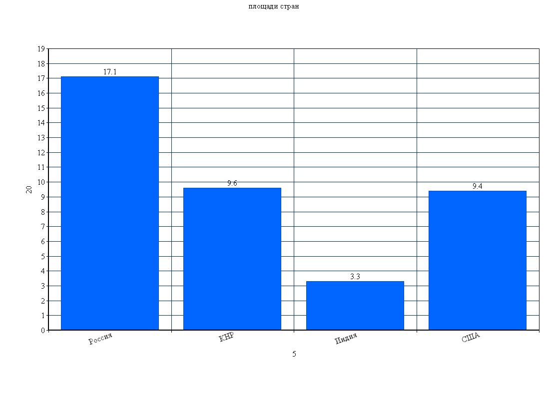 а)площадь России равна 17,1 млн км(квадрат.), площадь КНР - 9,6 млн км(квадрат.), площадь Индии - 3,3 млн км(квадрат.) и площадь США - 9,4 млн км(квадрат.);