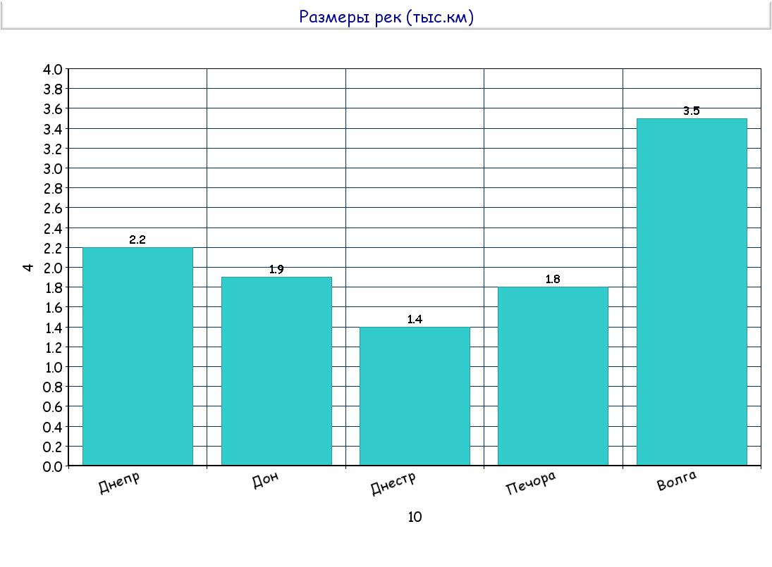 б) длина Днепра - 2,2 тыс. км, Дона - 1,9 тыс. км, Днестра - 1,4 тыс. км, Печоры - 1,8 тыс. км, Волги - 3,5 тыс. км.