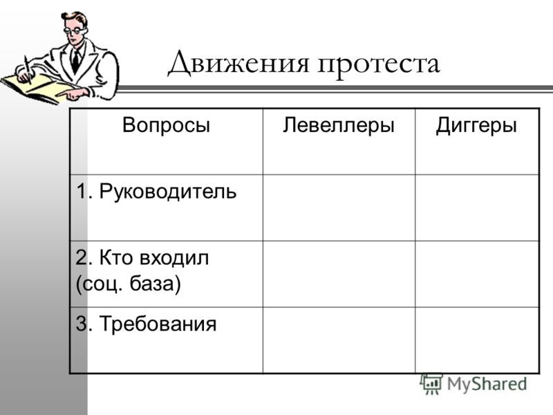 Левеллеры 1)Джон Лильберн 2)Низы армии 3)требовали равные права для всех граждан