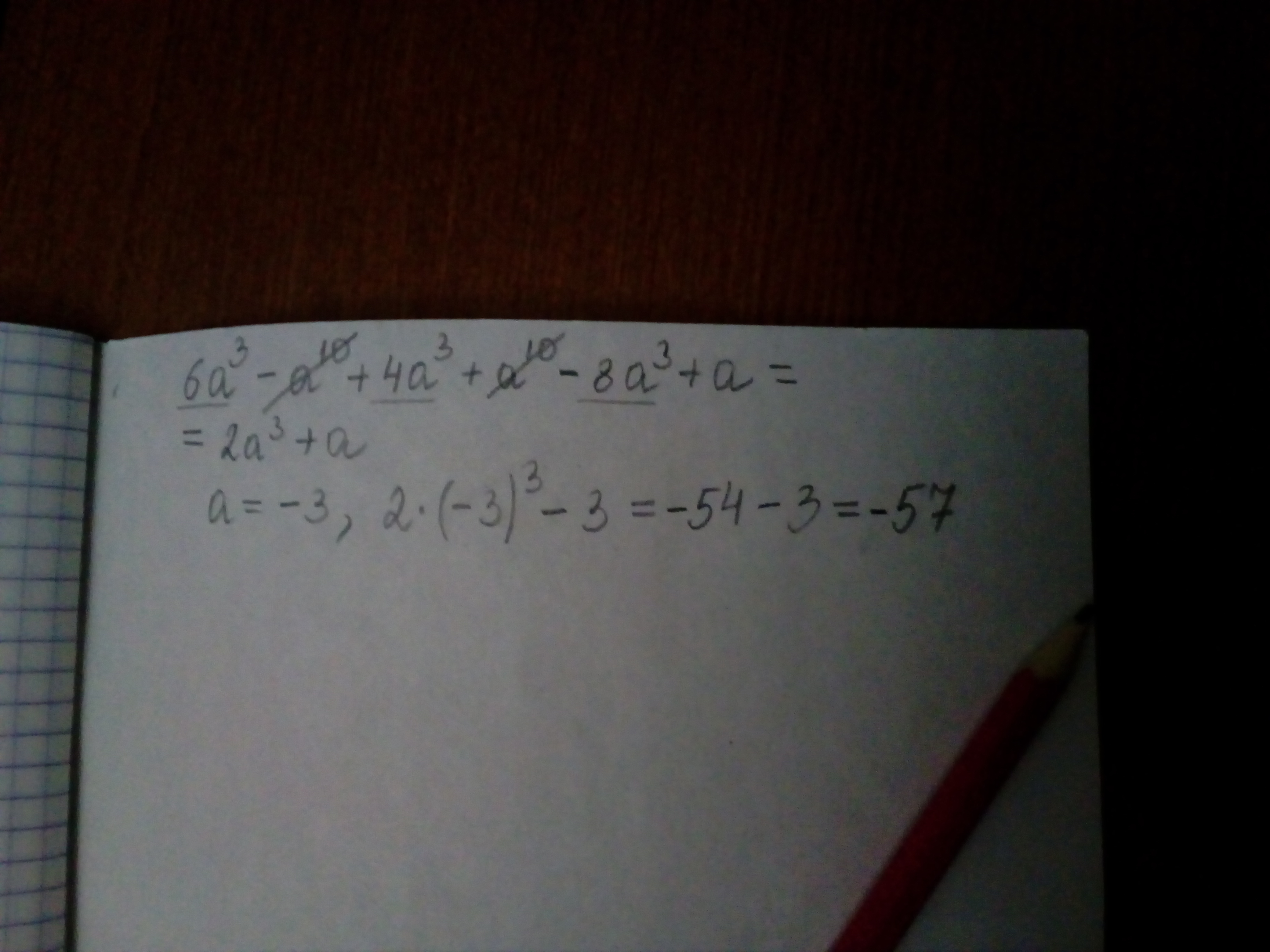 Получится 2*a в третьей степени + а. a=-3, 2*(-3) в третьей степени - 3 = -54-3=57
