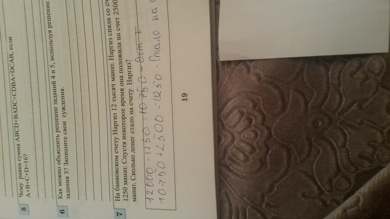 на банковском счету Наргиз 12 000 манат. Наргиз сняла со счета 1250 манат. Спустя некоторое время она положила на счёт 2500 манат. Сколько денег на счету на Наргиз.