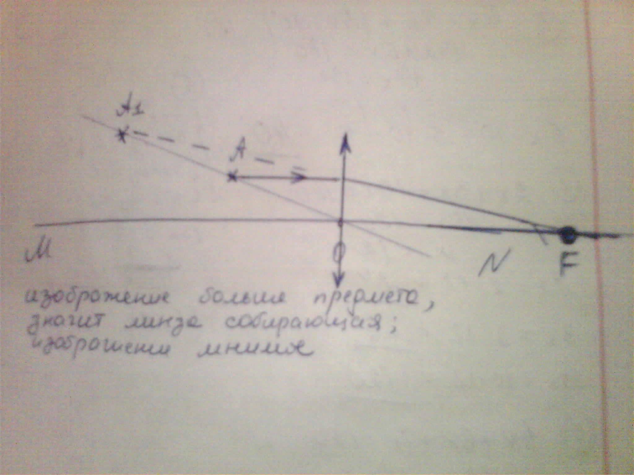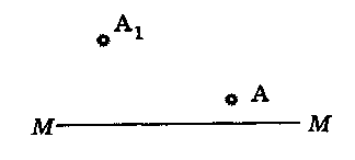 На рисунке показаны положение оптической оси MM тонкой линзы, светящийся точки A и её изображения A1 . Найдите построением положение центра линзы и её фокусов.