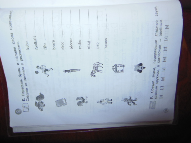Помоги пожалуйста задание по англ.сделать.«Переставь буквы и напиши слова правильно соедини их линиями с рисунками. kodo; fooldalt; fihs; dezra; ckoc; tdocor; rotdo; nikg; nep; heuso».