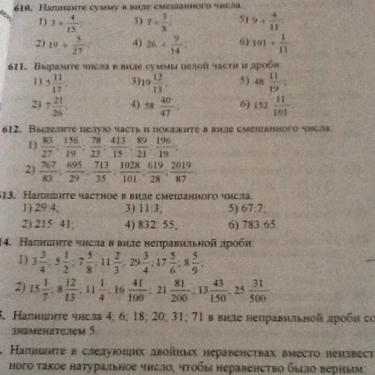 в номере 612 числитель раздели на знаменатель, например 83/27=83:27=3,074074074074. Убираем цифры после запятой, получаем 3(это целая часть). Дальше это число умножаем на знаменатель: 3*27=81. Вычитаем из числителя 81: 83-81=2. 2 - это новый числитель. Получаем 3 2/27.